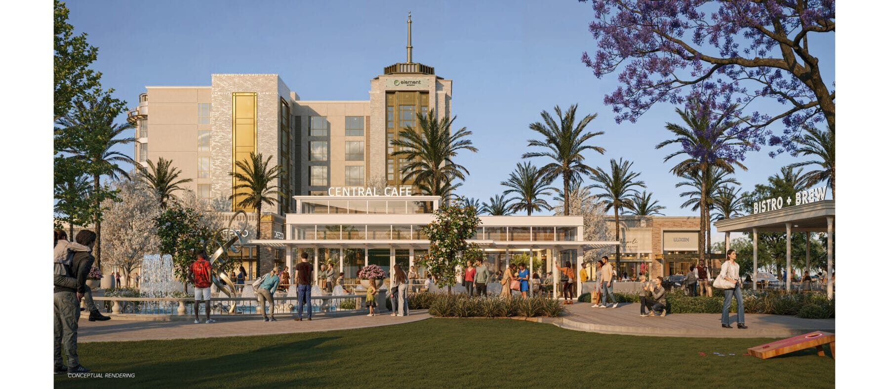 Lush landscaping and artistic waterscape elements create a welcoming outdoor environment, providing local residents with an enticing place to meet with friends over coffee or relax around the fountain.
